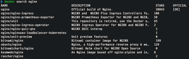 Docker Hub에서 제공하는 공식 이미지를 검색하는 명령어예요. (Docker Hub 사이트에서도 확인할 수 있어요)